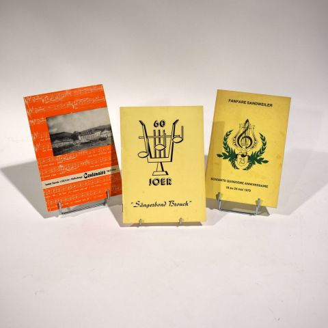 1) Société Chorale Caecilia Walferdange Centenaire 1862-1962, Imprimerie Centrale Luxembourg, 2) Fanfare Sandweiler 75e anniversaire 1979, Imprimerie Print-Service, 3) 60 Joer Sängerbond Brouch, 1975