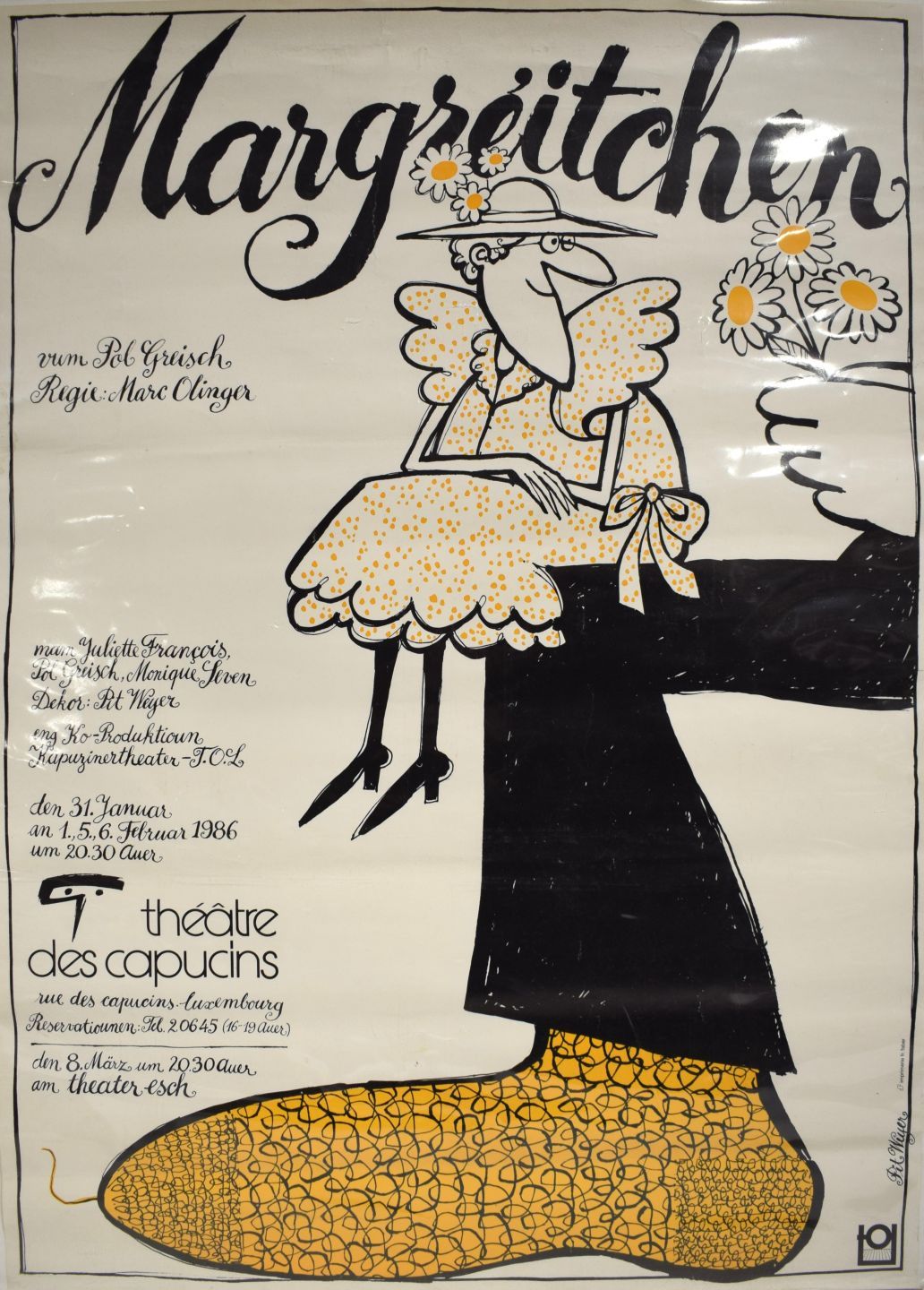 Theater poster by Pit Weyer for the play "Margréitchen" vum Pol Greisch. 1986, Imprimerie Faber de Mersch. 70 x 50 cm