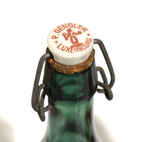Antique brown glass beer bottle, body engraved "P. GENGLER. Luxembourg", porcelain stopper missing