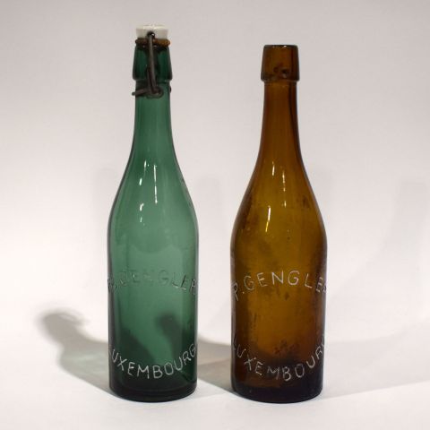 Antique brown glass bottle engraved "P. GENGLER. Luxembourg" with missing stopper. Includes dark glass bottle