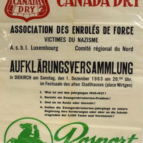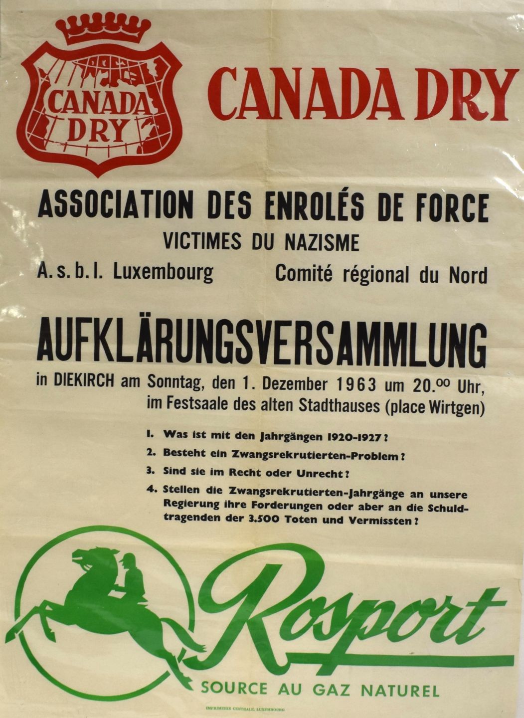 Poster for a 1963 conference of the Association des Enrolés de Force, sponsored by Canada Dry and the Rosport spring, Imprimerie Centrale, Luxembourg, fine condition, 71 x 51 cm