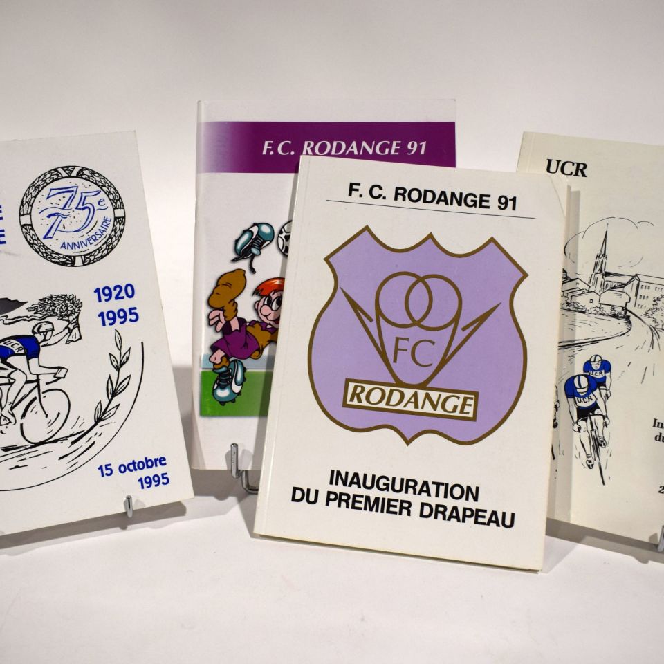 1) FC Rodange 91 10th anniversary 1991-2001, 2) FC Rodange 91 Inauguration of the 1st flag, 1992, 3) UCR Union cycliste Rodange 1920 1988, 4) Union cycliste Rodange 75th anniversary 1920 1995