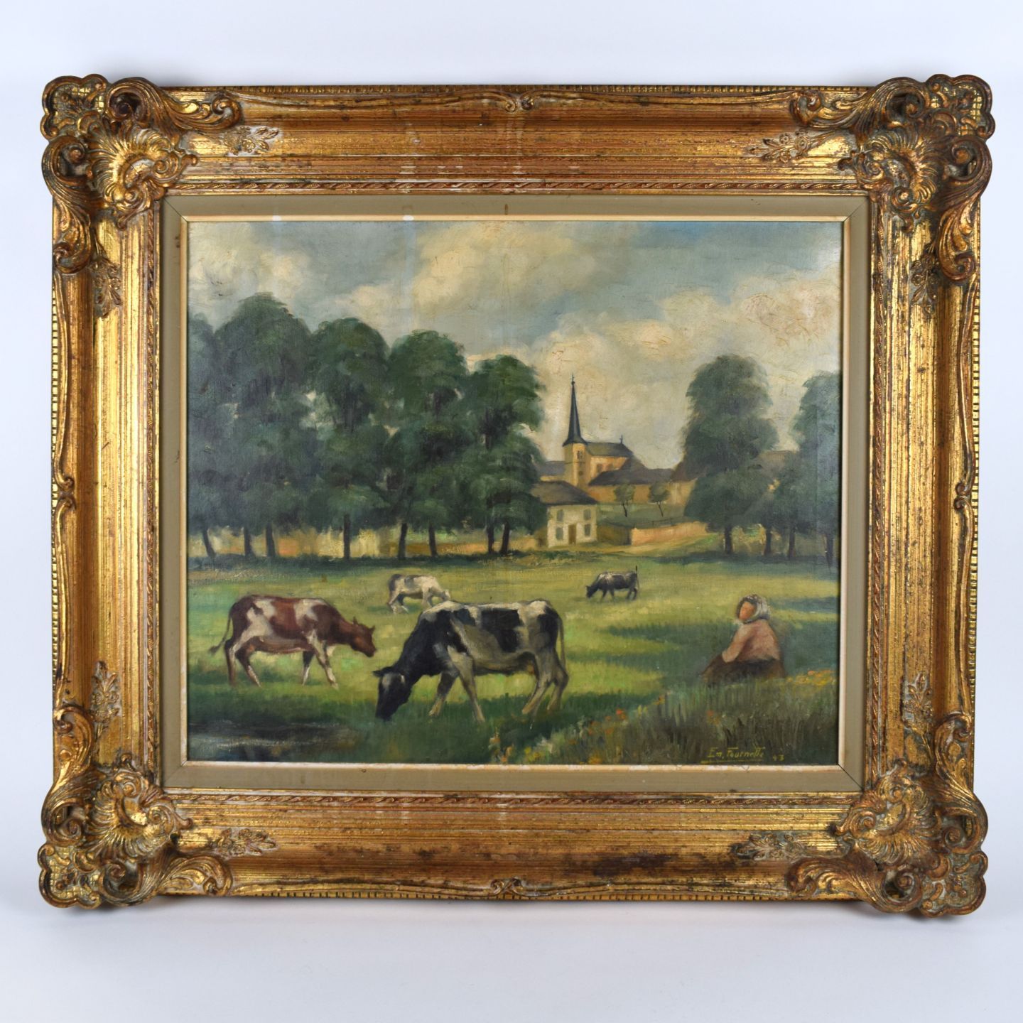 Emile FOURNELLE (1914), Vue du clocher d'un village des terres Rouges depuis un paturage, Oil on canvas signed lower right. Dated 43.