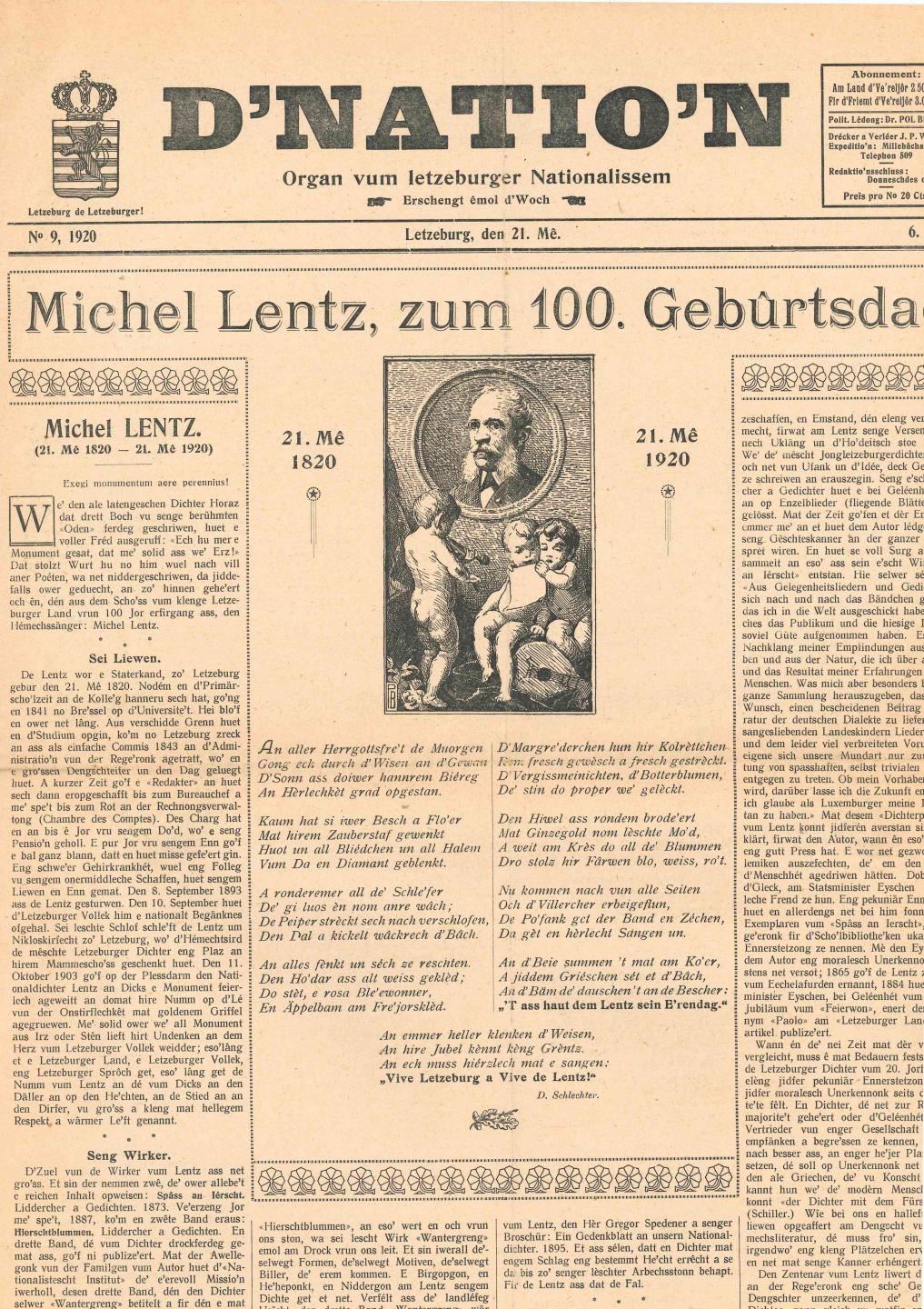 LENTZ. Special issue of the newspaper D'Natio'N, Organ vum letzeburger Nationalissem for the 100th anniversary of Michel Lentz's birth, 1920.