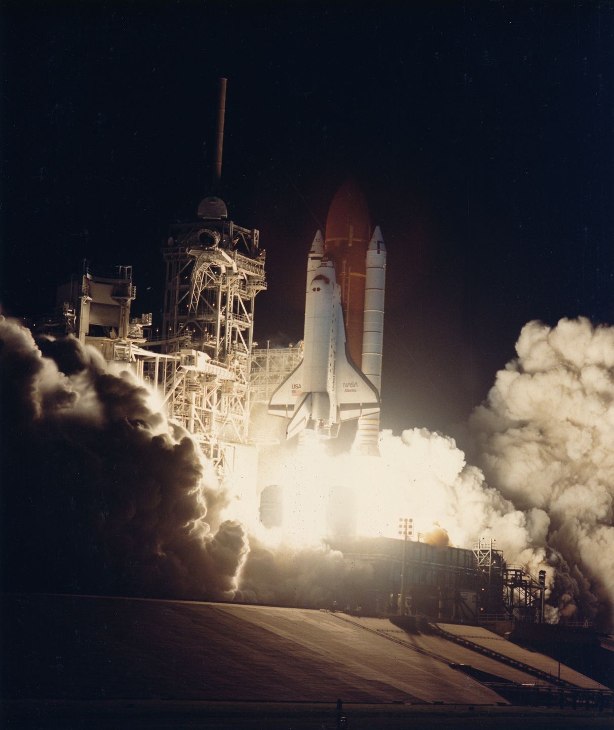 NASA. Night takeoff of the space shuttle ATLANTIS (STS-38) in the early morning of November 15, 1990. Vintage chromogenic print on paper: "THIS PAPER MANUFACTURED BY KODAK". NASA logo and numbering in the margin on the front. NASA logo and typed caption on back 25.5 x 20.4cm with margins.