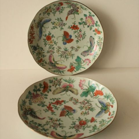 Famille rose porcelain plate, China, 18th century, circular, decorated with peonies, chrysanthemums and butterfly; cracks and small restoration - Diameter : 18,5 cm