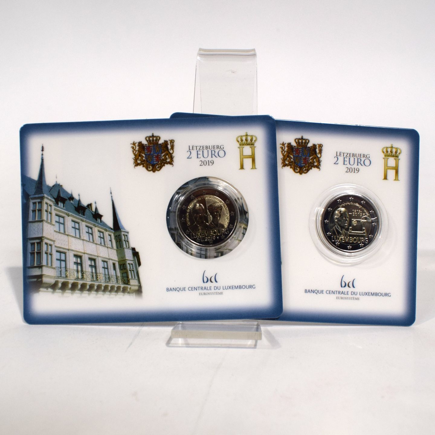 Reunion of 2 commemorative 2 euro cardcoins in Plexiglas: "Lëtzebuerg" Collection: Centenary of Grand Duchess Charlotte's accession to the throne, Banque Centrale du Luxembourg edition, 2019