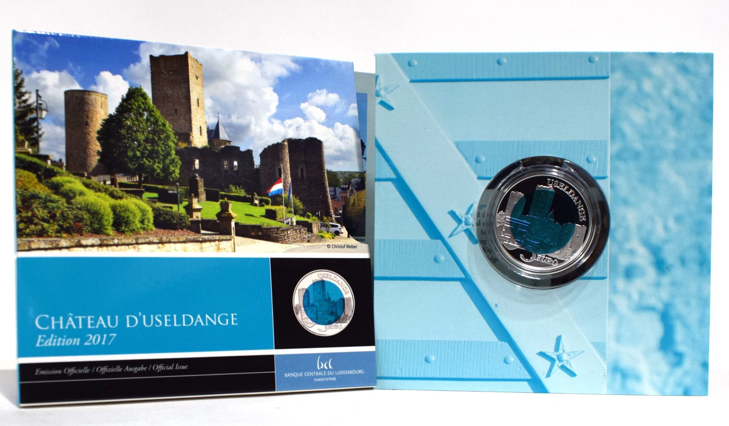 USELDANGE. Pouch containing a 5-euro silver coin: Château d'Useldange, Banque Centrale du Luxembourg edition, in Plexiglas capsule and case, 2017