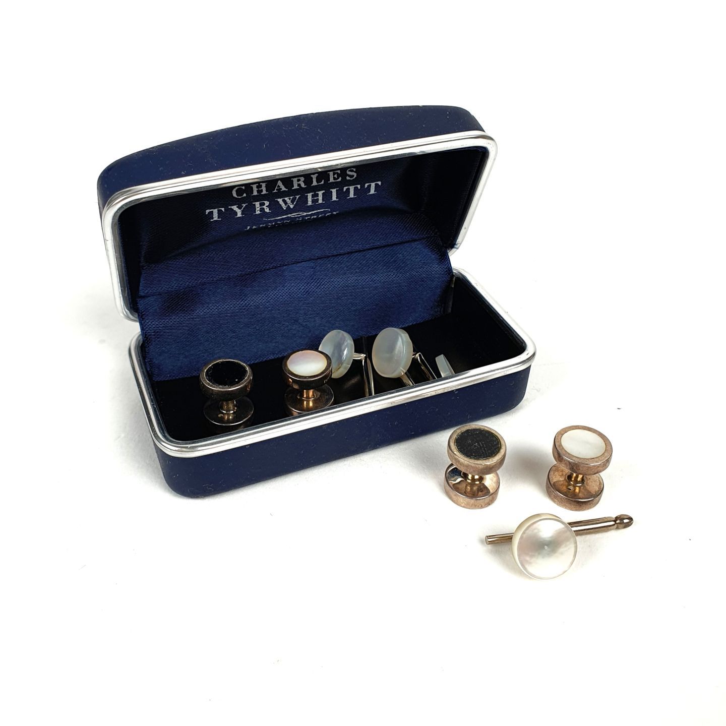 CUFFLINKS. Reunion of 2 pairs of silver-plated metal cufflinks, one pearly face and one obsidian face.
