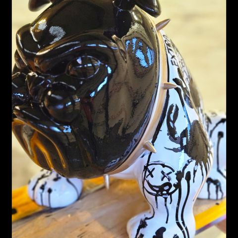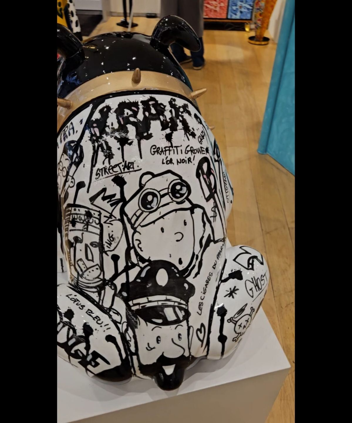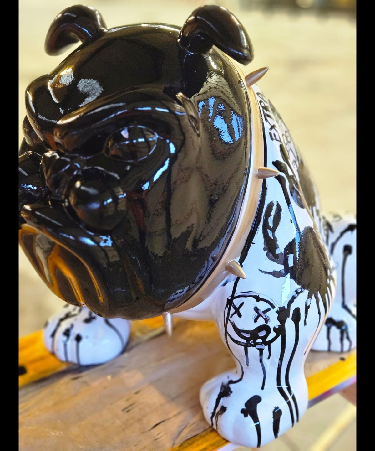 BULLDOG BLACK WHITE 2024 1/1 - Arthugo, This bulldog, reinterpreted by Art Hugo, is a true work of art. Bold black lines, gold accents and cartoon characters create a striking contrast against the pristine white. A masterpiece for lovers of contemporary art and pop culture. Acrylic, Resin, Body varnish, 100x100x80