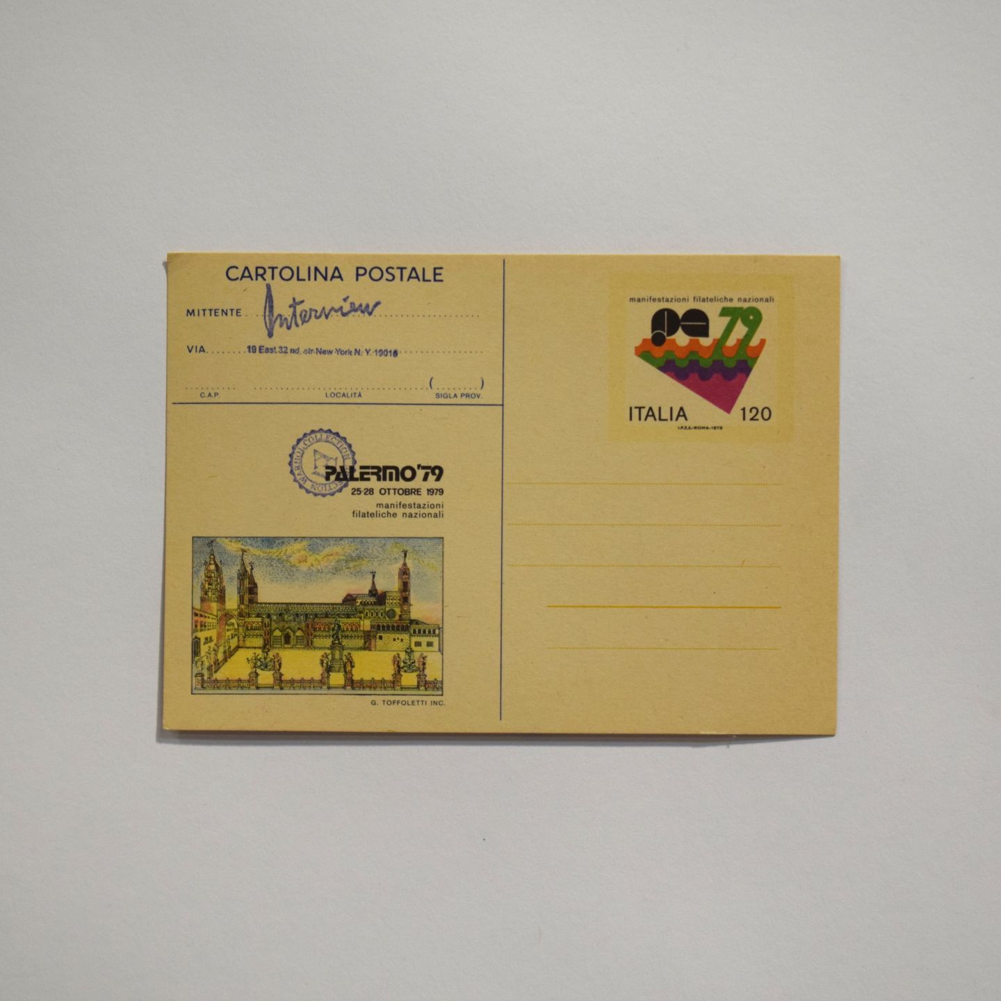 Red postcard of a brunette woman by A. Warhol, signed, October 1979