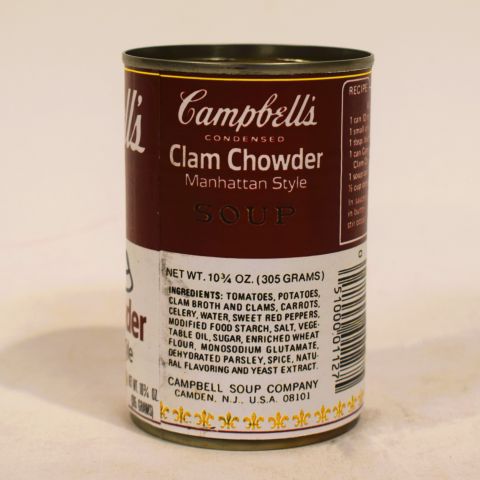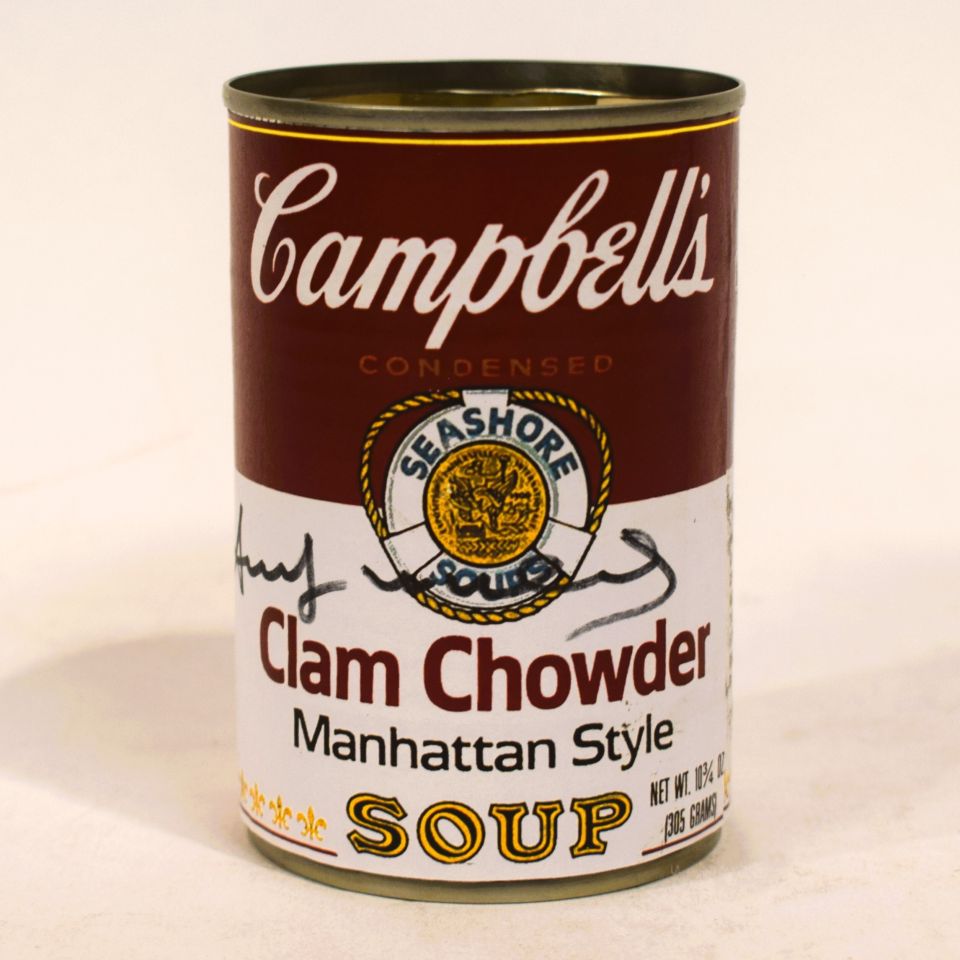 Can signed by Warhol: Clam Chowder Soup, original work in metal and labels