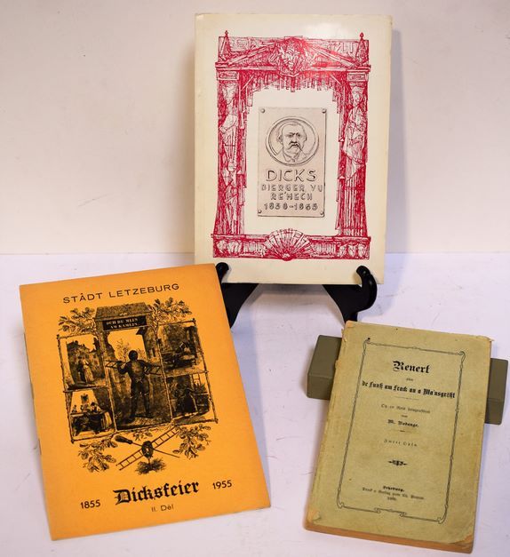 (Literature) 1. Michel Rodange: Renert oder de Fuuss am Frack an a Ma'nsgrësst, 1909. 2. Brochure of the "Stâdt Letzeburg" about the "Dicksfeier" (1855-1955), 2. Dél, 1955. 3. Brochure of the "St. Cecilia Choir of Remich" about the occasion "150 Joer Dicks, 1823-1973", 1973.
