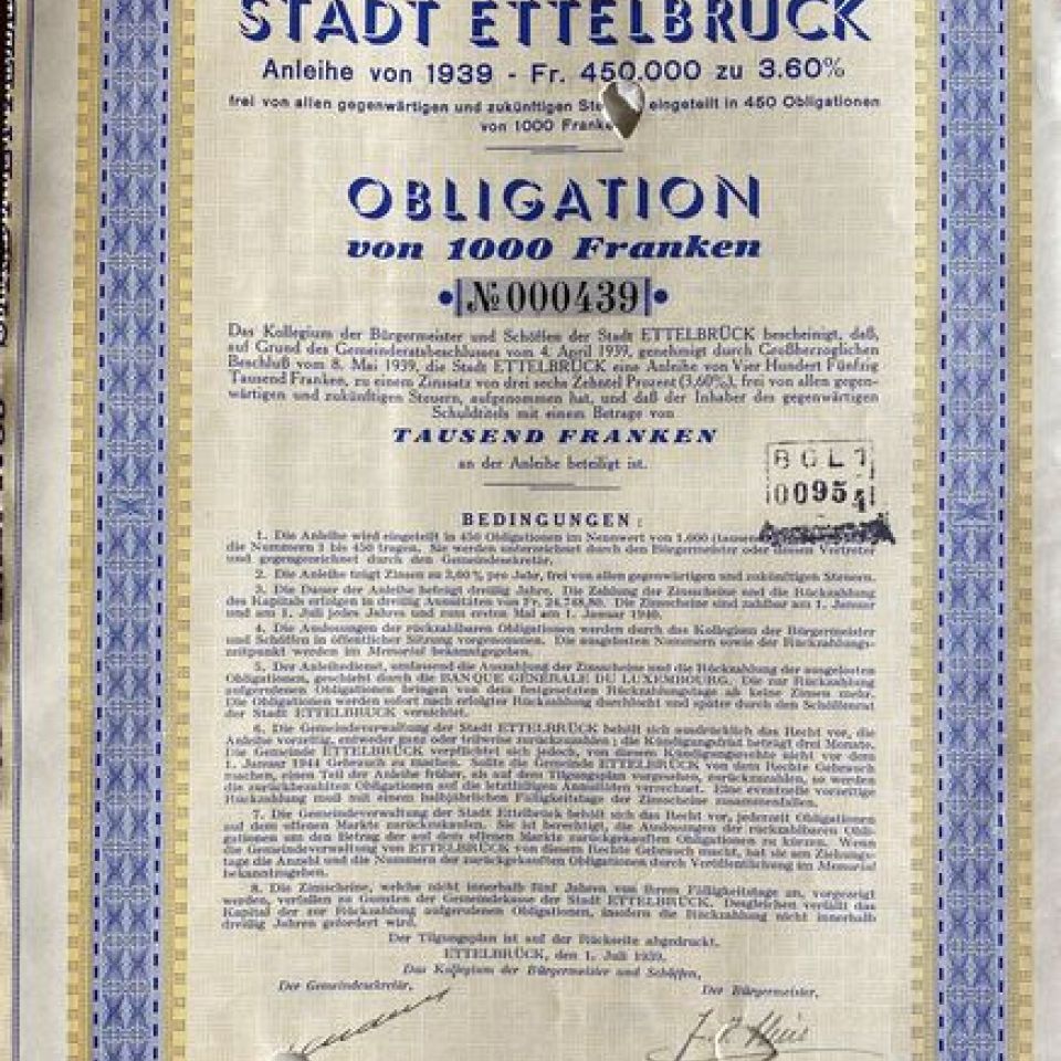 Borrowed from the city of Ettelbruck 1939, with coupons and certificate of identification stuck to the back of 1951, nice condition
