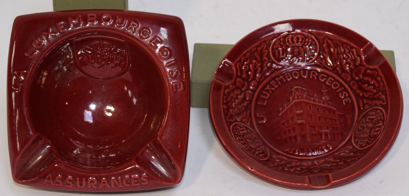Set of 2 advertising ashtrays of Assurrances LA LUXEMBOURGEOISE, one Villeroy & Boch designed by Jean PETERS, the other one of the pottery of Jean PETERS