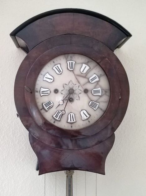 WALL HANGER of half-moon shape with three weights. Four+two bells chime, walnut and walnut veneer case, 2 side opening bellows. Dial in alabaster with hand-painted central motif, enamel numerals (dial glued back), balance with signature "SCHMIT ex Ettelbruck". ca 1850. 58 x 42 cm