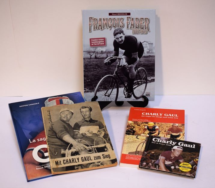 (Sport) 1. Charly Gaul, Tour de France, 1958 (includes CD). 2. Gaston Zangerlé: Charly Gaul, Der Engel der Berge und seine Zeit, 1988. 3. Jang Goldschmit: Mit Charly Gaul zum Sieg, 1958. 4. Gaston Zangerlé: La saga Charly Gaul, 2006. 5. Henri Bressler: François Faber, 1887-1915, 2009 (with a document from the same year).