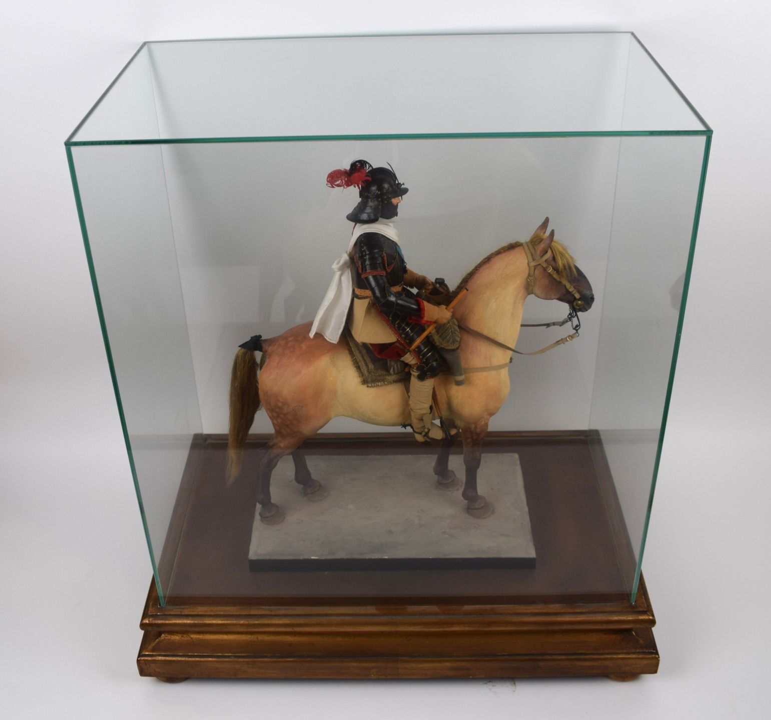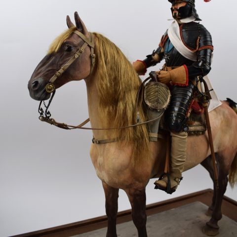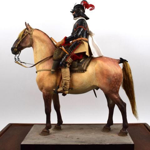 LELIEPVRE Eugène (1908-2013). Cavalier, French cavalry general of the Thirty Years' War. Unique piece with great attention to detail and historical reproduction. Exceptional work in mixed media (wood, plaster, cloth, copper, embroidery, skin, leather, metal and trimmings). Figurine on a large gilded wood base 54 cm long, 33 cm wide and 10 cm high, topped by a glass bell 50 cm high, 48 cm long and 27 cm wide. Eugène Lelièvre, military and animal painter and sculptor, became official army painter in 1951. Fascinated by uniforms and historical reconstitution, he began making figurines in 1942, creating 159 infantrymen and 40 cavalrymen. These are faithful reproductions of period costumes. Eugène Lelièvre was awarded the Chevalier de la Légion d'honneur and Officier de l'Ordre national du Mérite for his outstanding work.