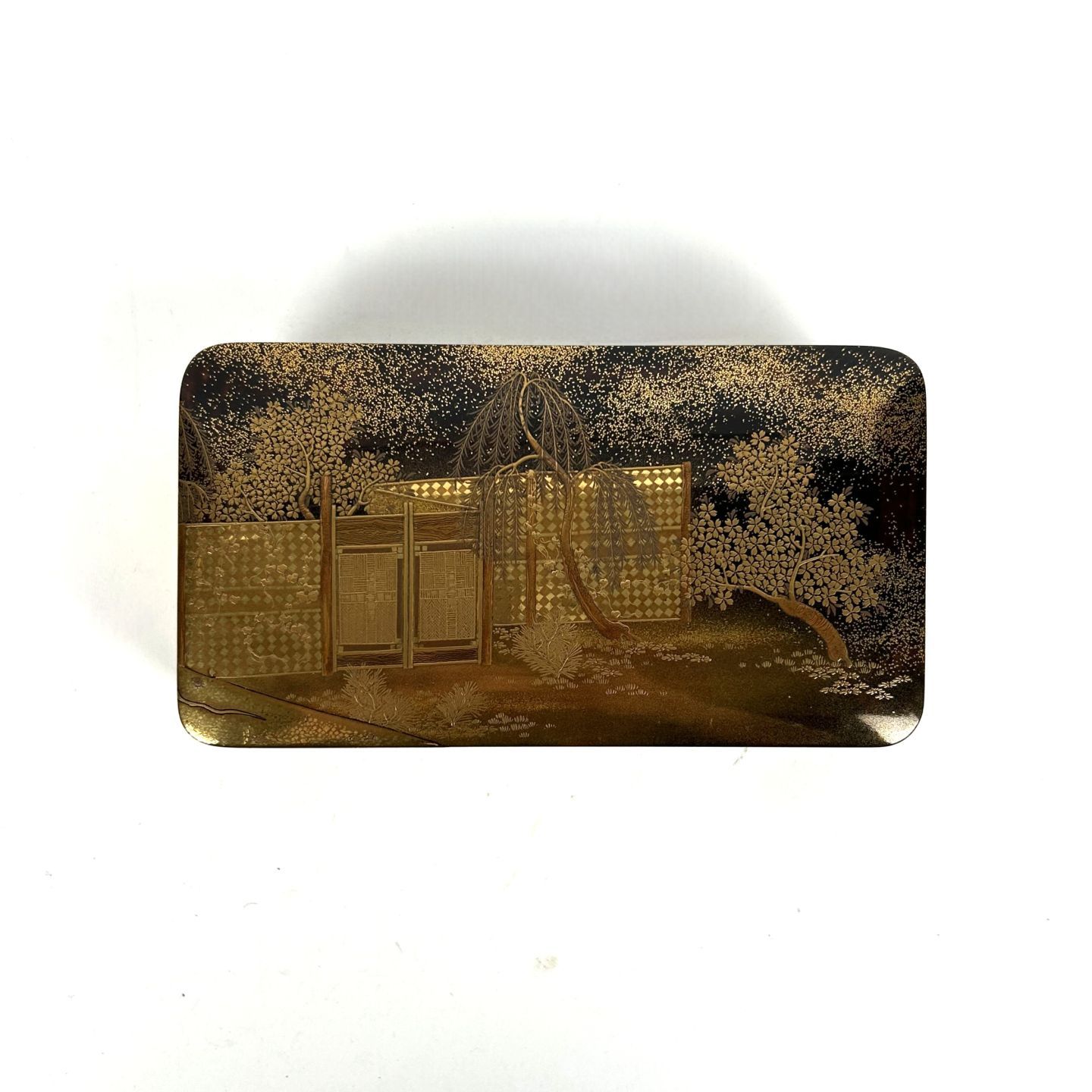 Rectangular brown lacquer Kobako with fundame, hirame and kirikane gold lacquer decoration of a portal, cherry blossoms and weeping willow. The interior in nashiji lacquer.