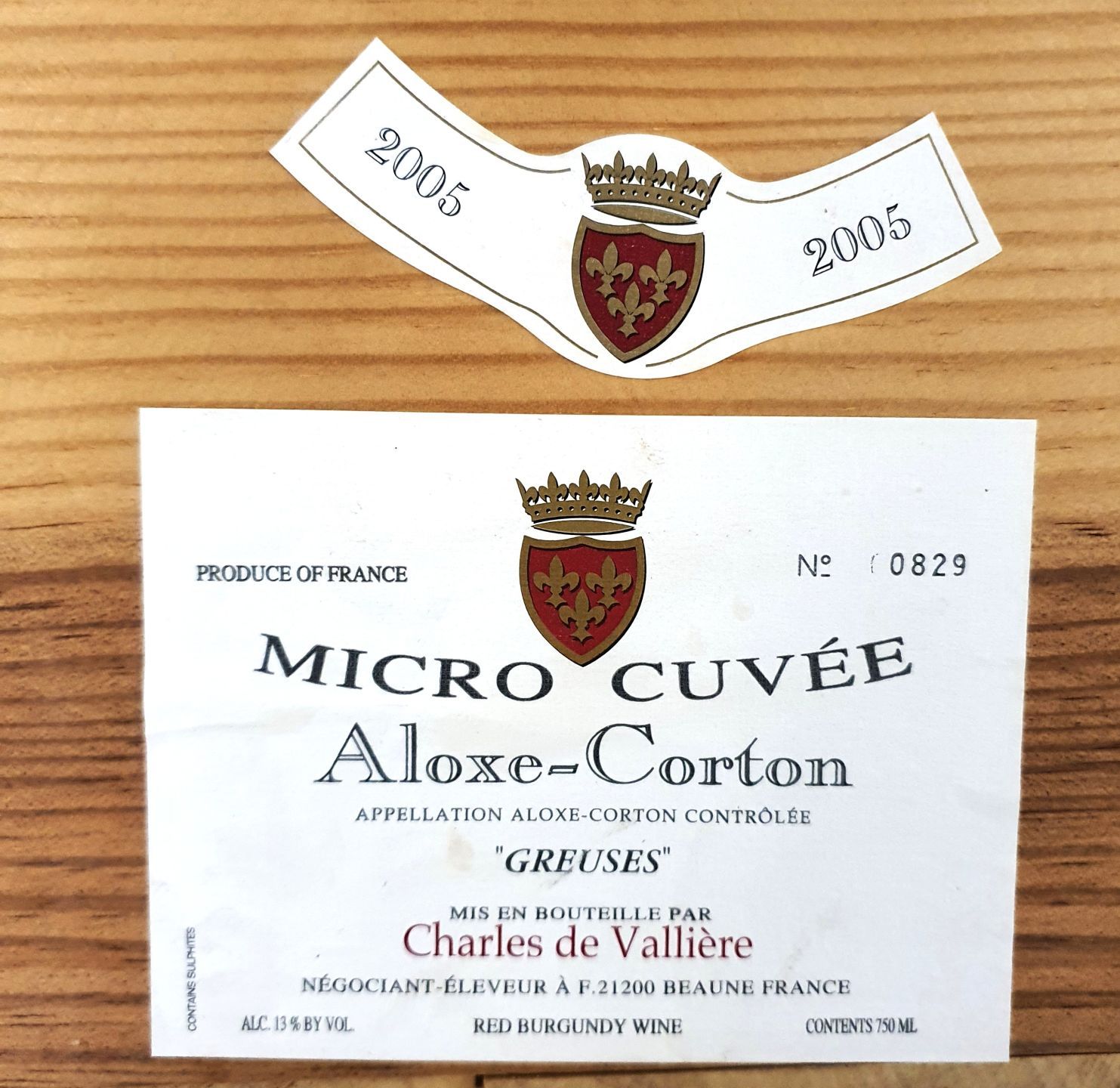 ALOXE. Wooden case containing 12 bottles of Aloxe-Corton, Micro cuvée "Greuzes" by Charles de Vallière, Vintage 2005