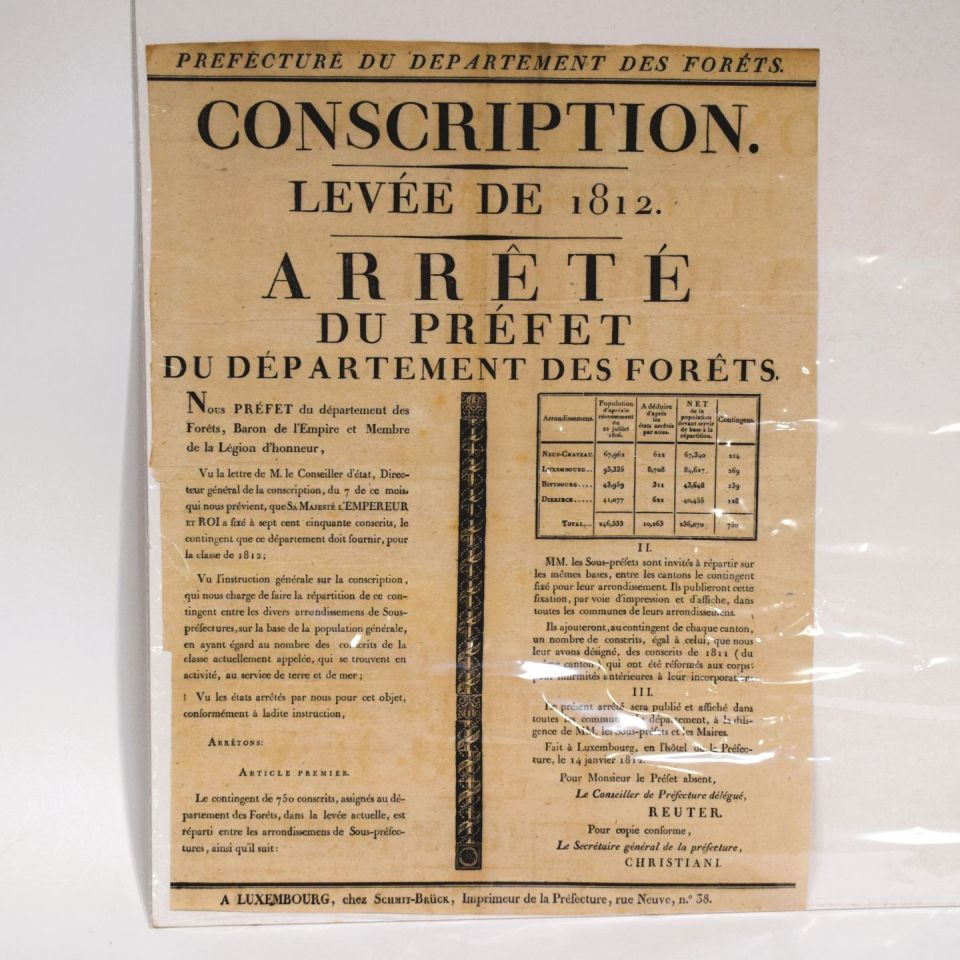 Très belle affiche de la Préfecture du département des Forêts "Conscription. Levée de 1812. Arrêté du Préfet (...)", A Luxembourg, chez Schmit-Brück. Intéressante affiche indiquant le contingents à lever. Bel état, 47,5 x 35 cm
