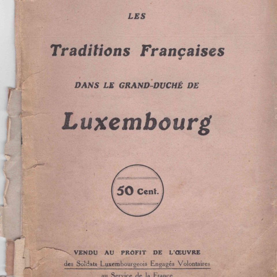 Frantz FUNCK-BRENTANO : Les Traditions Françaises dans le Grand-Duché de Luxembourg, vendu au profit de l'œuvre des soldats Luxembourgeois Engagés Volontaires au Service de la France, Paris Imprimerie Chantenay, 1917, 16 pp., couverture délabrée, déchirure au bloc papier