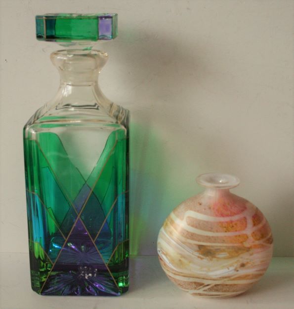 Carafe en cristal taillé et décor polychrome - Hauteur : 24,5 cm & Soliflore en verre soufflé à décor marbré - Hauteur : 11 cm