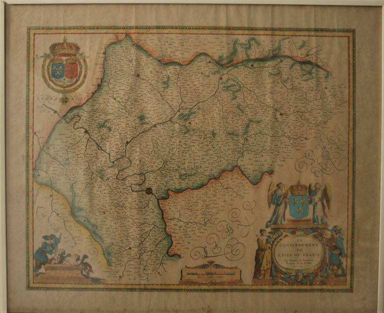 Damien de TEMPLEUX : Le Gouvernement de l'Isle de France, Carte géographique ancienne, 1620, corroyage, cartouche et armoiries réhaussés - Dimensions : 50 x 60 cm