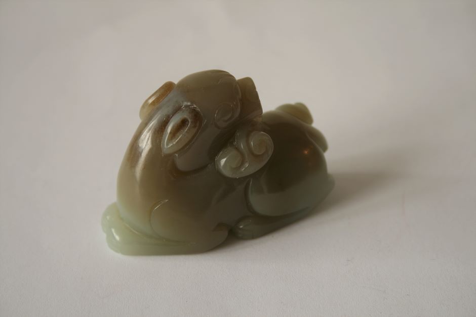 Chimère en jade, Chine, Couchée, tête tournée vers l'arrière, tenant un lingzhi dans sa gueule - Longueur : 6 cm, Hauteur : 3,5 cm