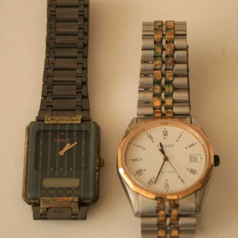 Montre TISSOT, PR 100 P360/460, années 90, boîtier et bracelet en acier argenté et doré - Diamètre : 3,4 cm, Epaisseur : 0,7 cm + Montre TISSOT Twotimer D372 667, analogique et digitale, boîtier et bracelet en acier (forte oxydation) - Dimensions : 3 x 2,7 cm, Epaisseur : 0,7 cm