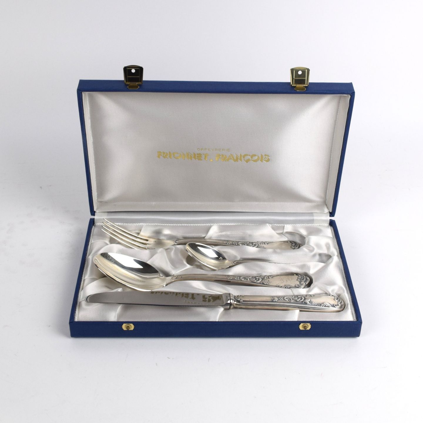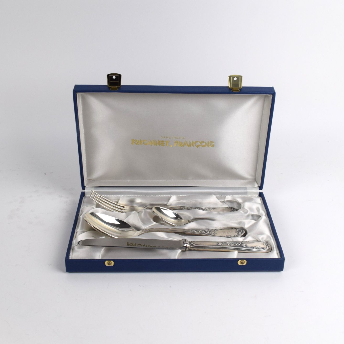 Coffret intérieur satin blanc brodé au nom de l'orfèvre.