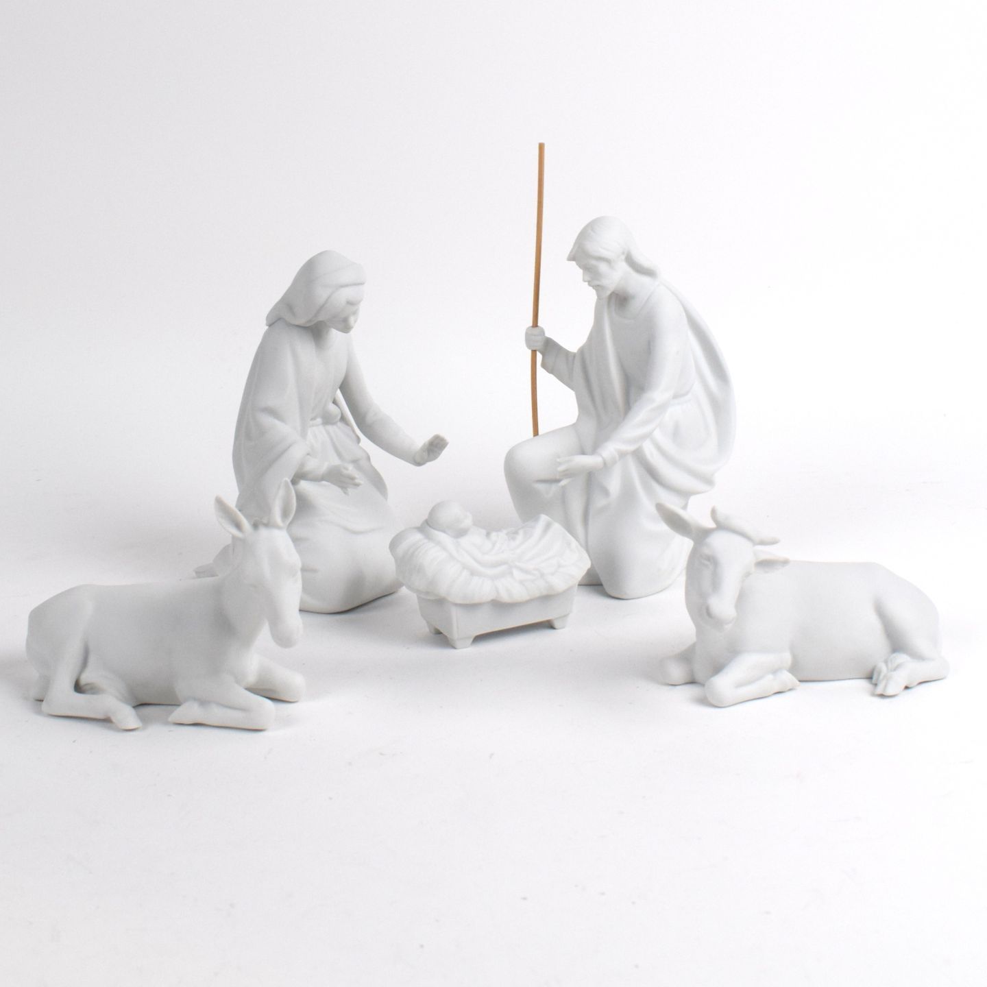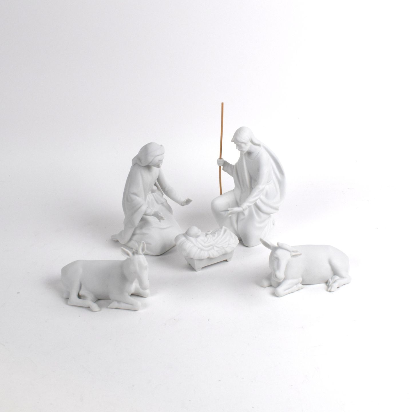ALLEMAGNE. Crèche composée de 5 personnages et animaux en biscuit Goebels. Main de Joseph manquante