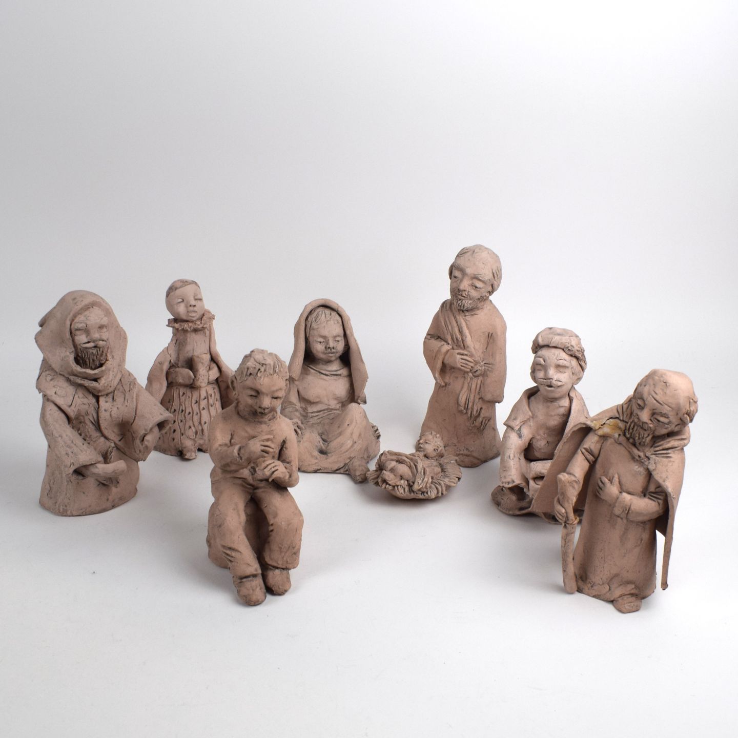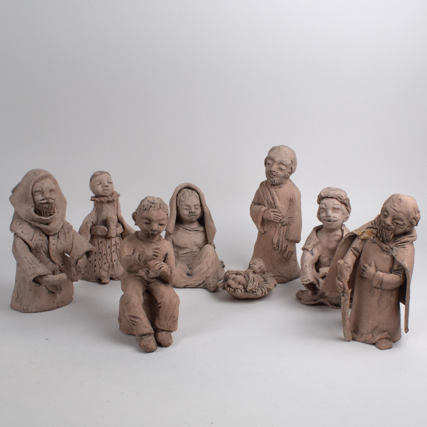 LUXEMBOURG. Crèche composée de 10 personnages et animaux en terre cuite. Fait main par Gaby Lassans au Centre d'éducation différenciée à Warken.