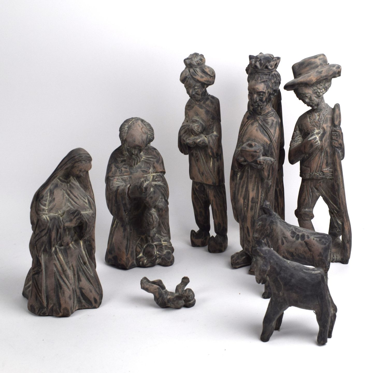 HAITI. Crèche composée de 8 personnages et animaux en bois. Epoque fin XXème siècle Hauteur : 24 cm
