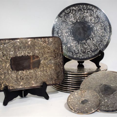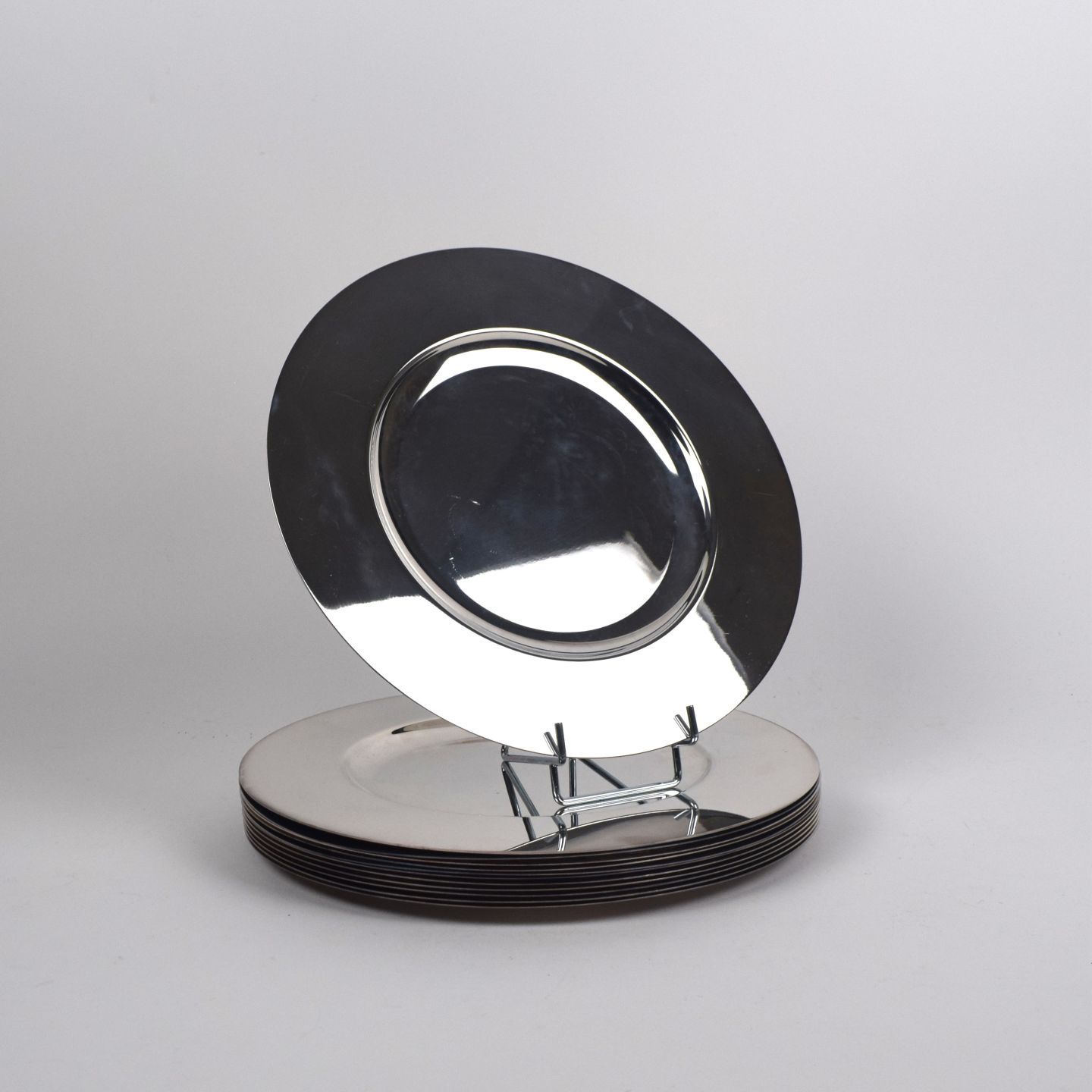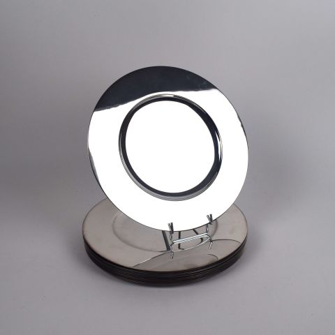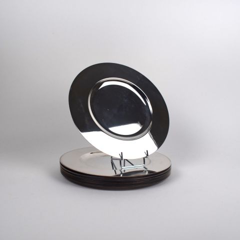 Suite de 12 SOUS-ASSIETTES en métal argenté, marque Arno. Diam : 30 cm