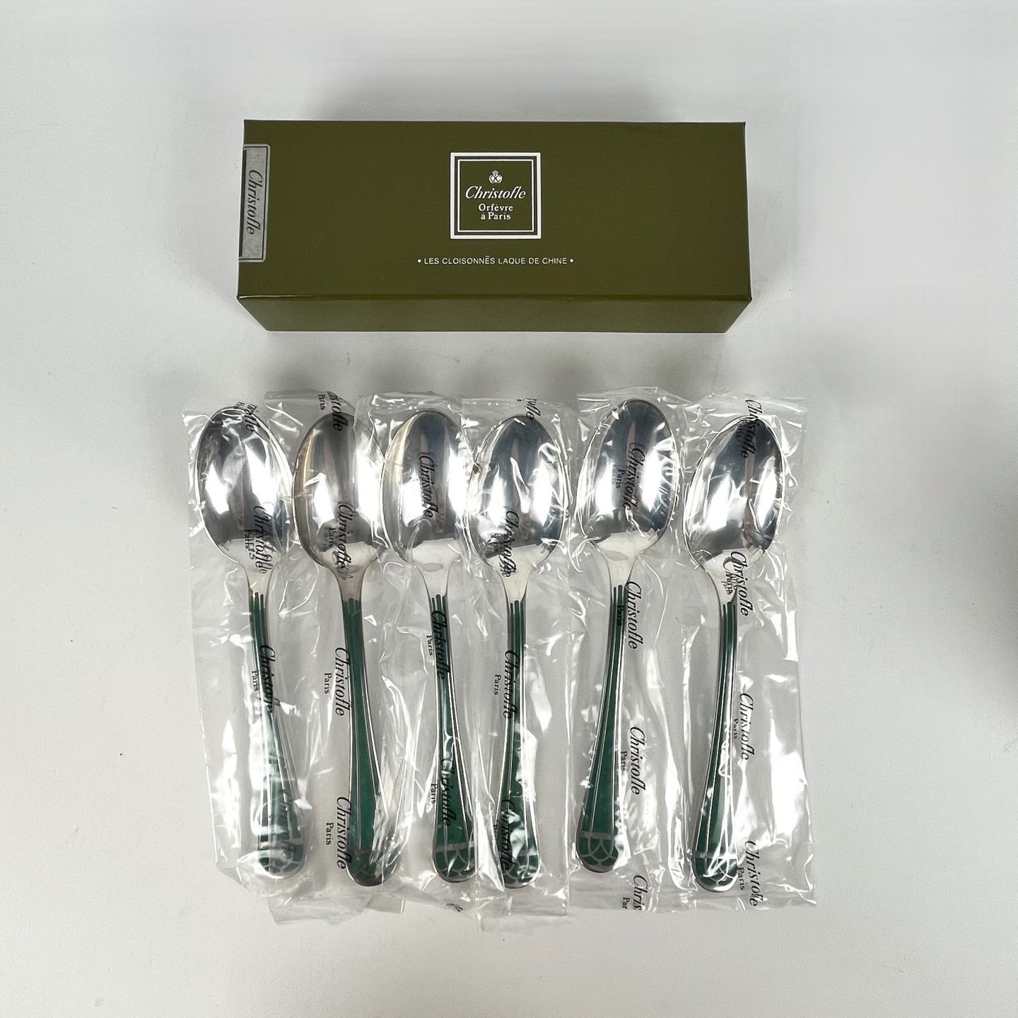 CHRISTOFLE. Modèle TALISMAN. 6 cuillères de table (laque verte de chine). Feutrine. Etat neuf, boite ouverte mais couverts sous plastique.