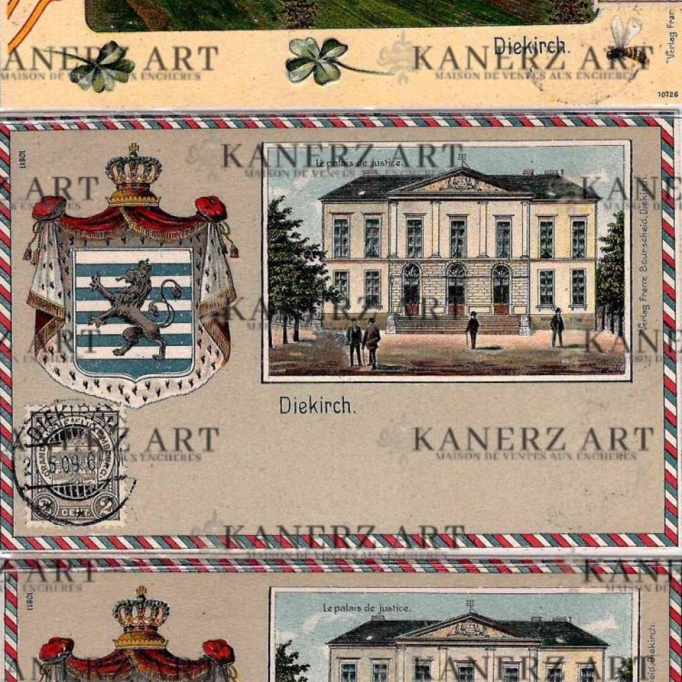 DIEKIRCH : 1. Panorama (coloriée), Rosenblatt (Frankfurt a. M.), 1909, timbre avec tampon sur la face avant, 2. Le palais de justice (coloriée), Rosenblatt (Frankfurt a. M.), 1909, timbre avec tampon sur la face avant, 3. Le palais de justice (coloriée), Rosenblatt (Frankfurt a. M.), ca. 1905, pas de texte + pas voyagée (De la collection Norbert HANSEN)