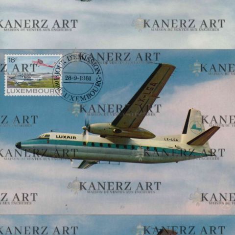Réunion de 3 cartes postales du premier Fokker Friendship F27 de la LUXAIR devant l'aérogare de l'aéroport de Luxembourg, dont 1 avec timbre et cachet postal "25 ans de la Luxair" 1987