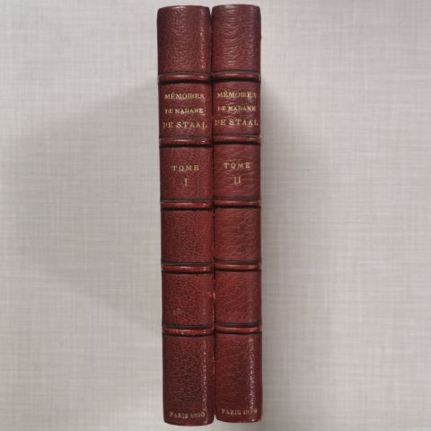 2 volumes In-12 plein maroquin rouge signée CANAPE-BELZ, dos à 5 nerfs, titre et tomaison dorés, roulette dorée sur les chasses, tranches dorées, Paris et date en queue.