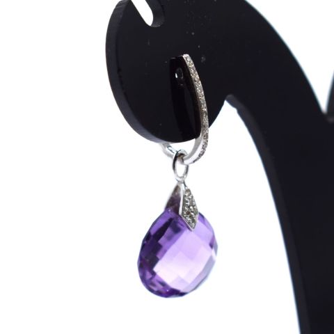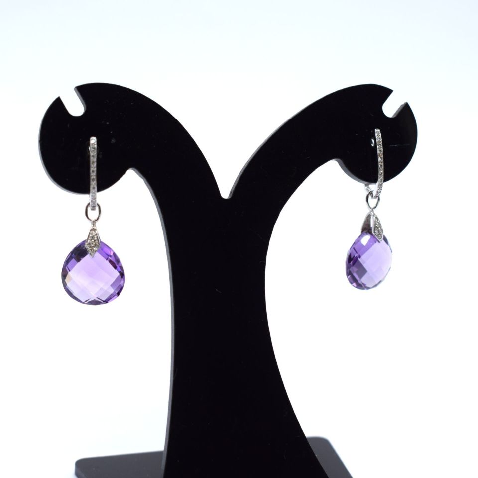 Paire de BOUCLES D'OREILLES en or blanc 18ct sertie de deux améthystes taille "briolette" et de diamants tailles éclat. Poids : 4.39g