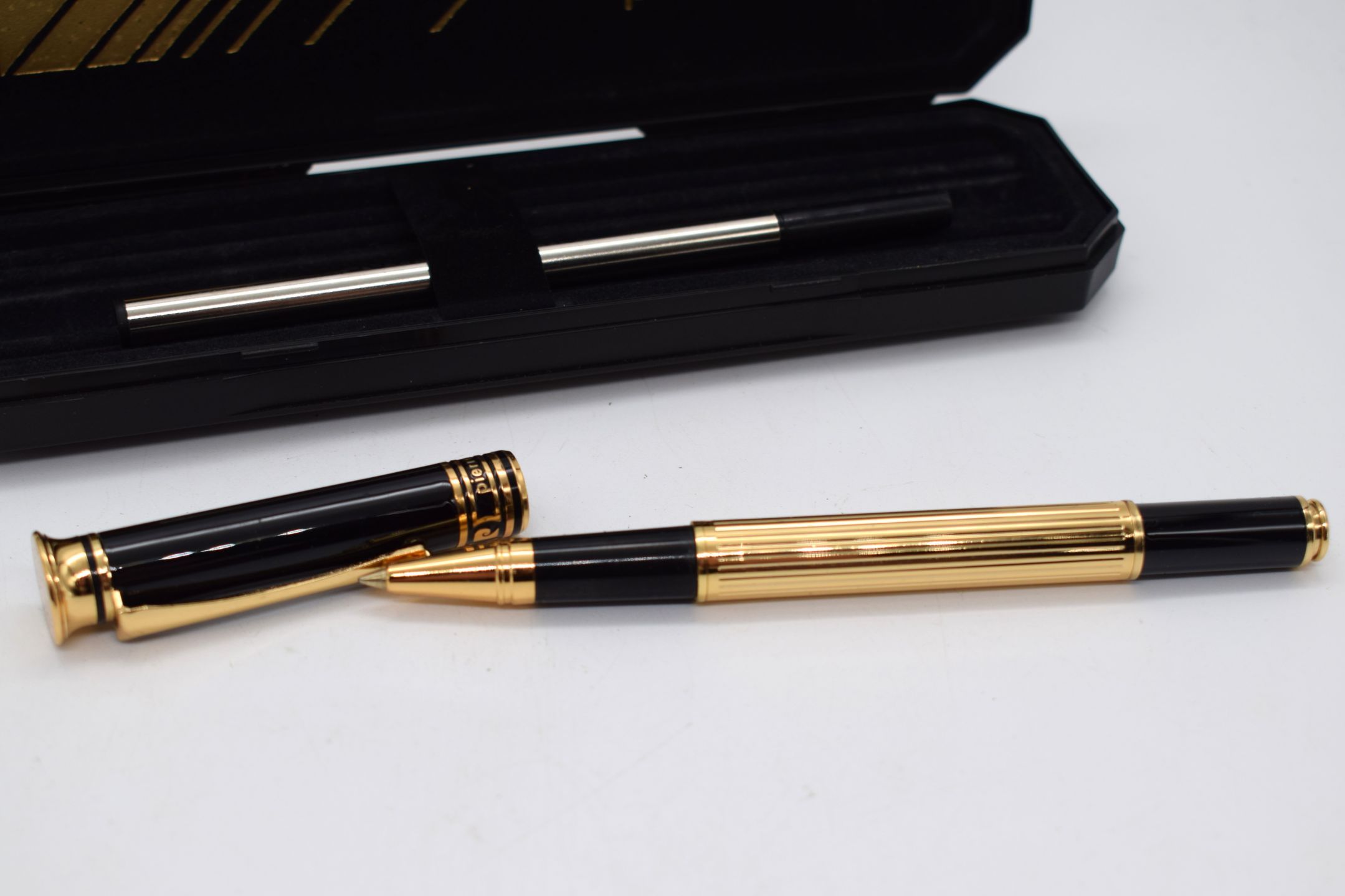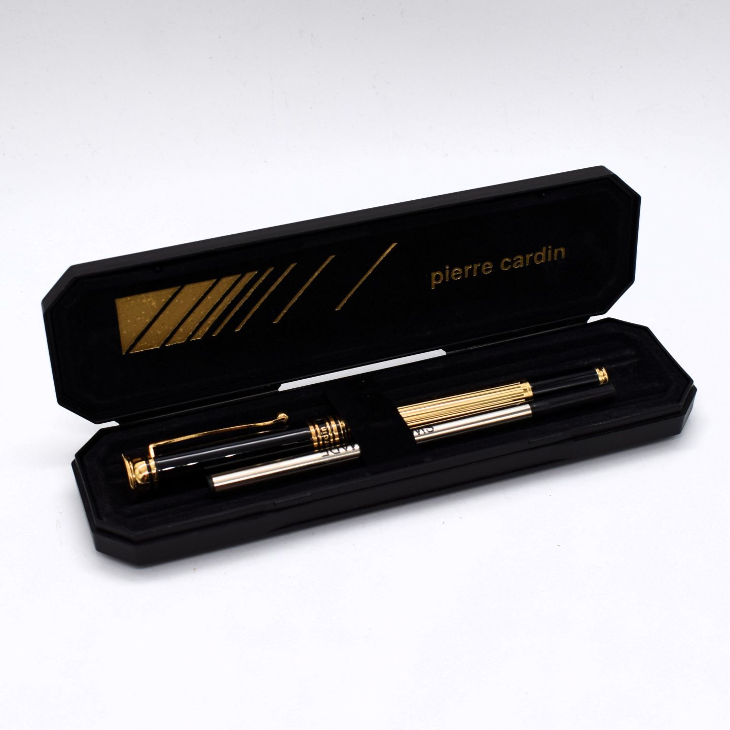 PIERRE CARDIN. Ensemble comprenant 1. un stylo bille. 2. un stylo à plume (sous bliser) avec cartouches. Dans leurs étuis.