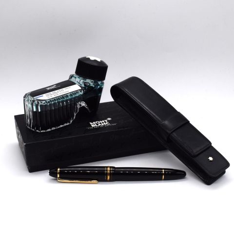 MONT BLANC. Stylo plume série MEISTERSTUCK, fût en résine noire et agrafes plaquées or, plume en or 14 ct, ainsi qu'un encrier.