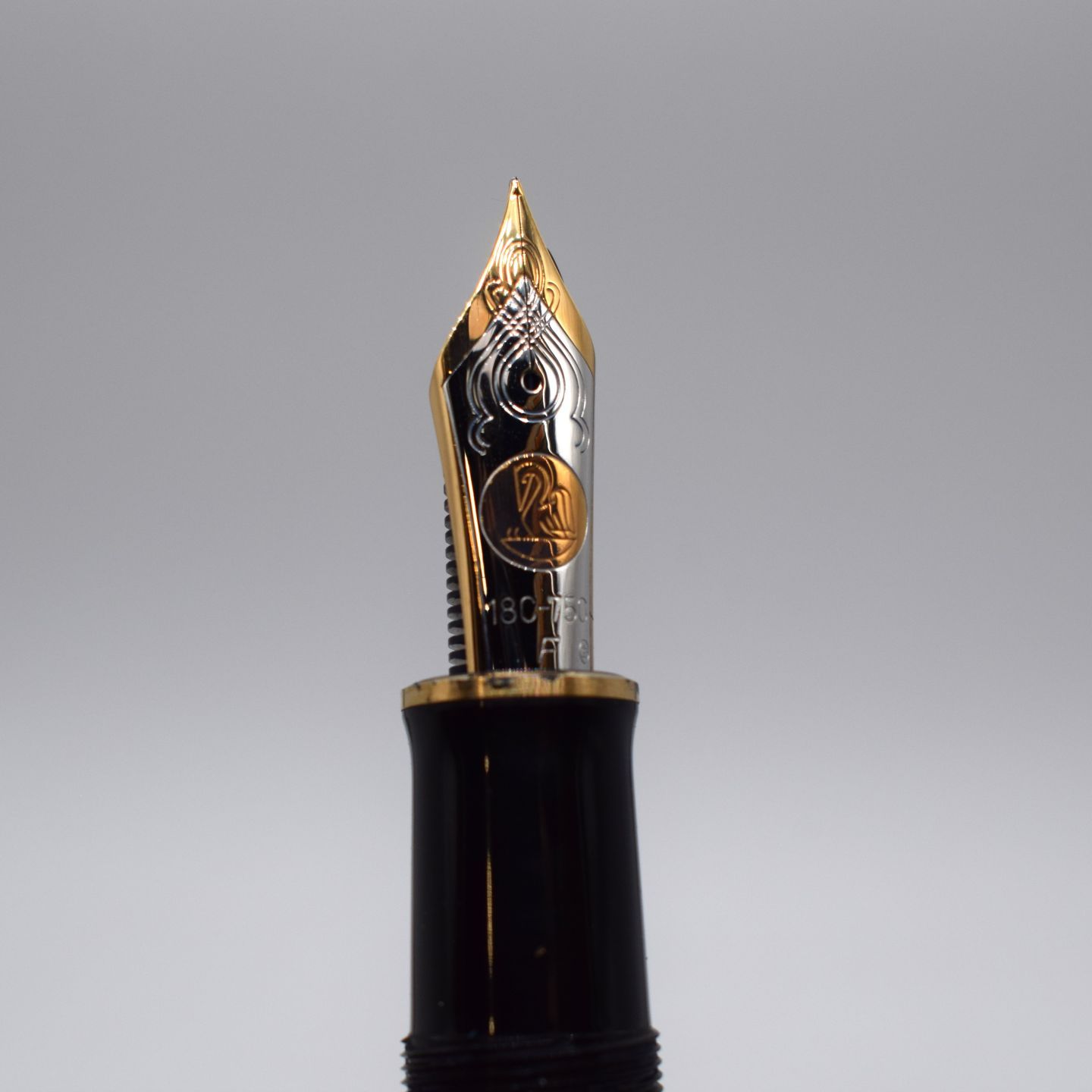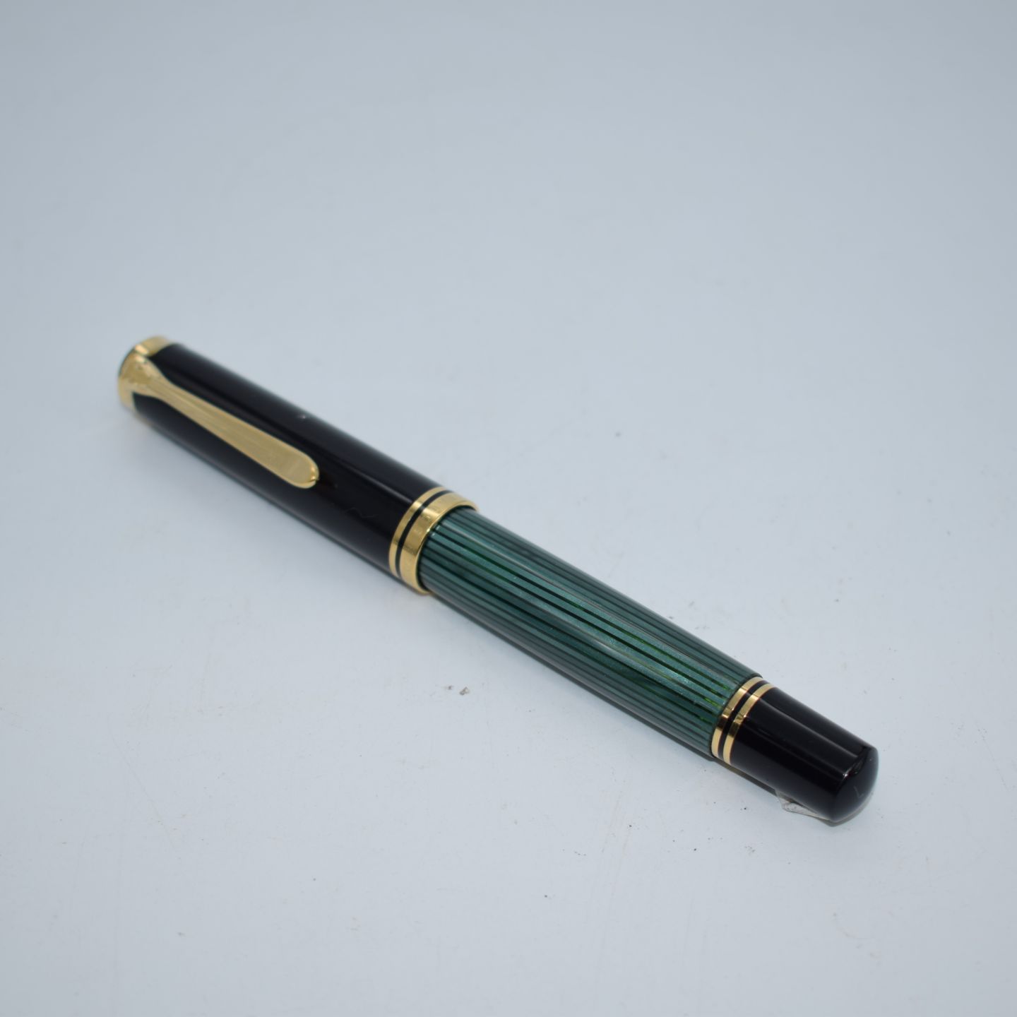 PELIKAN. Stylo plume en laque noire et verte, modèle Souverän M400. Plume en or 18 ct. On joint un encrier Royal Blue.
