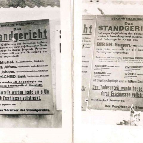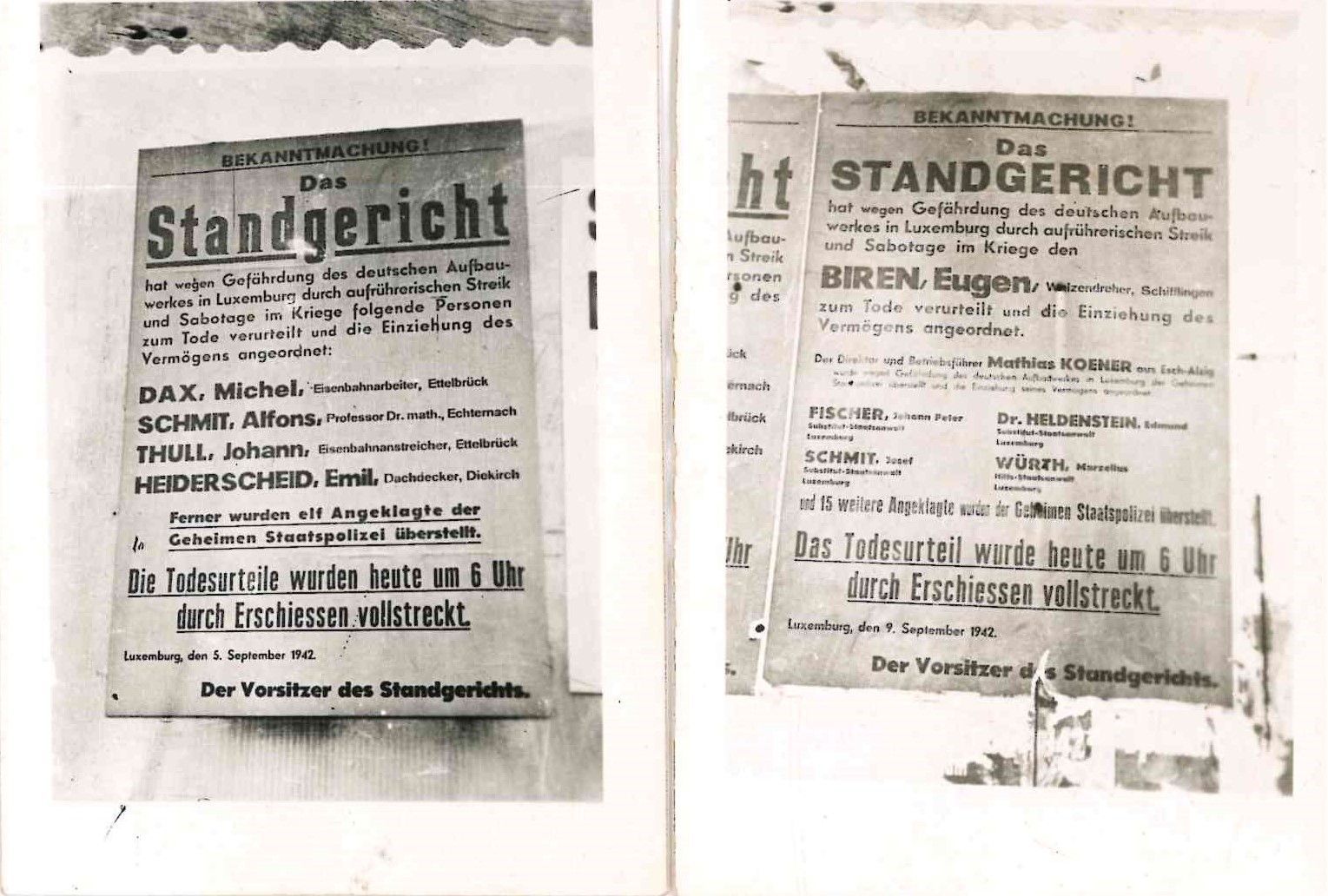 WAR II. Réunion de 2 petites photos privées des affiches allemandes annonçant le peleton d'exécution de résistants luxembourgeois. 1942