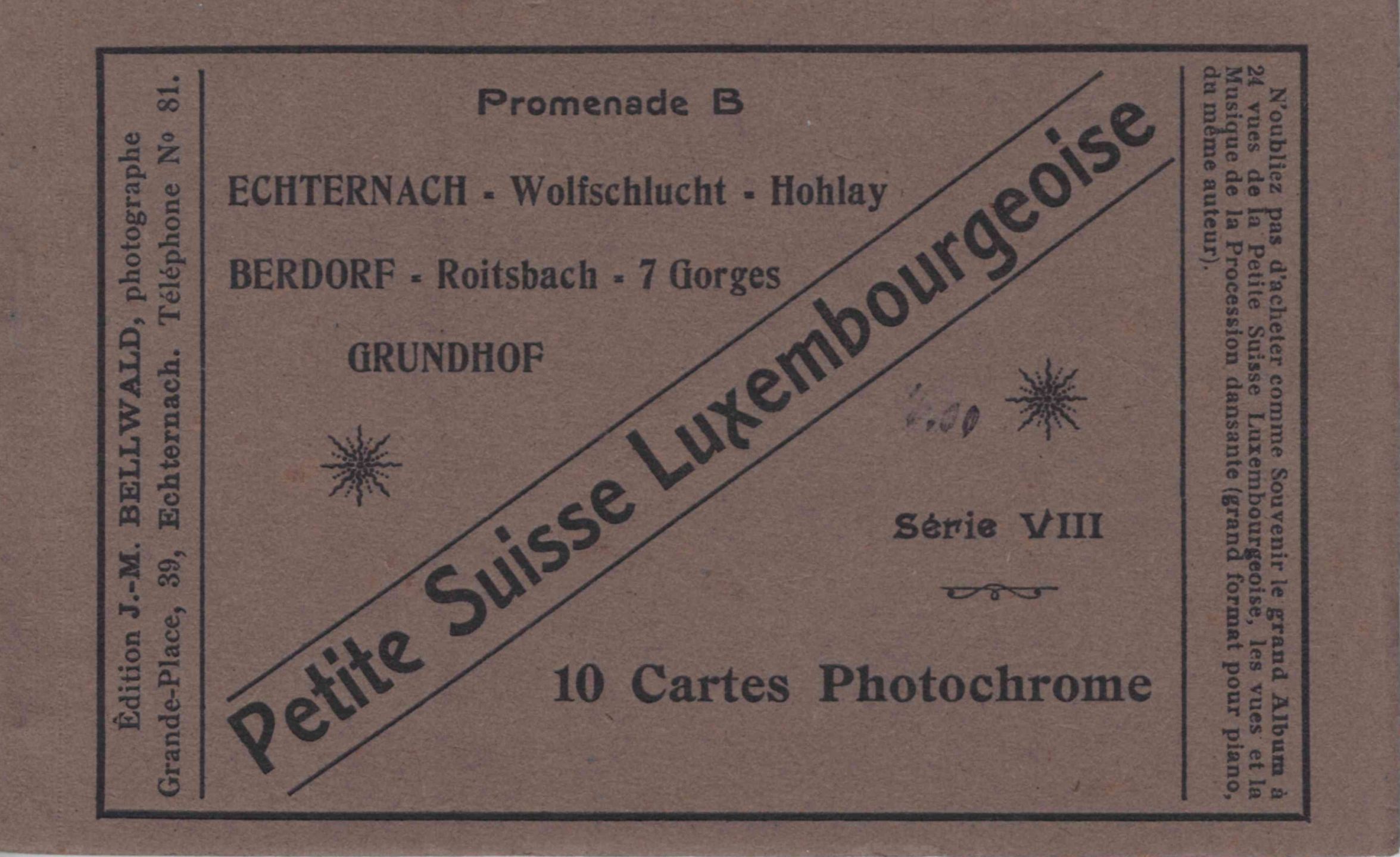 ECHTERNACH. Carnet de cartes postales autour d'Echternach "Promenade B" Petite Suisse Luxembourgeoise, série VIII, 10 cartes photochrome, édition Bellwald photographe, ca 1915, bel état