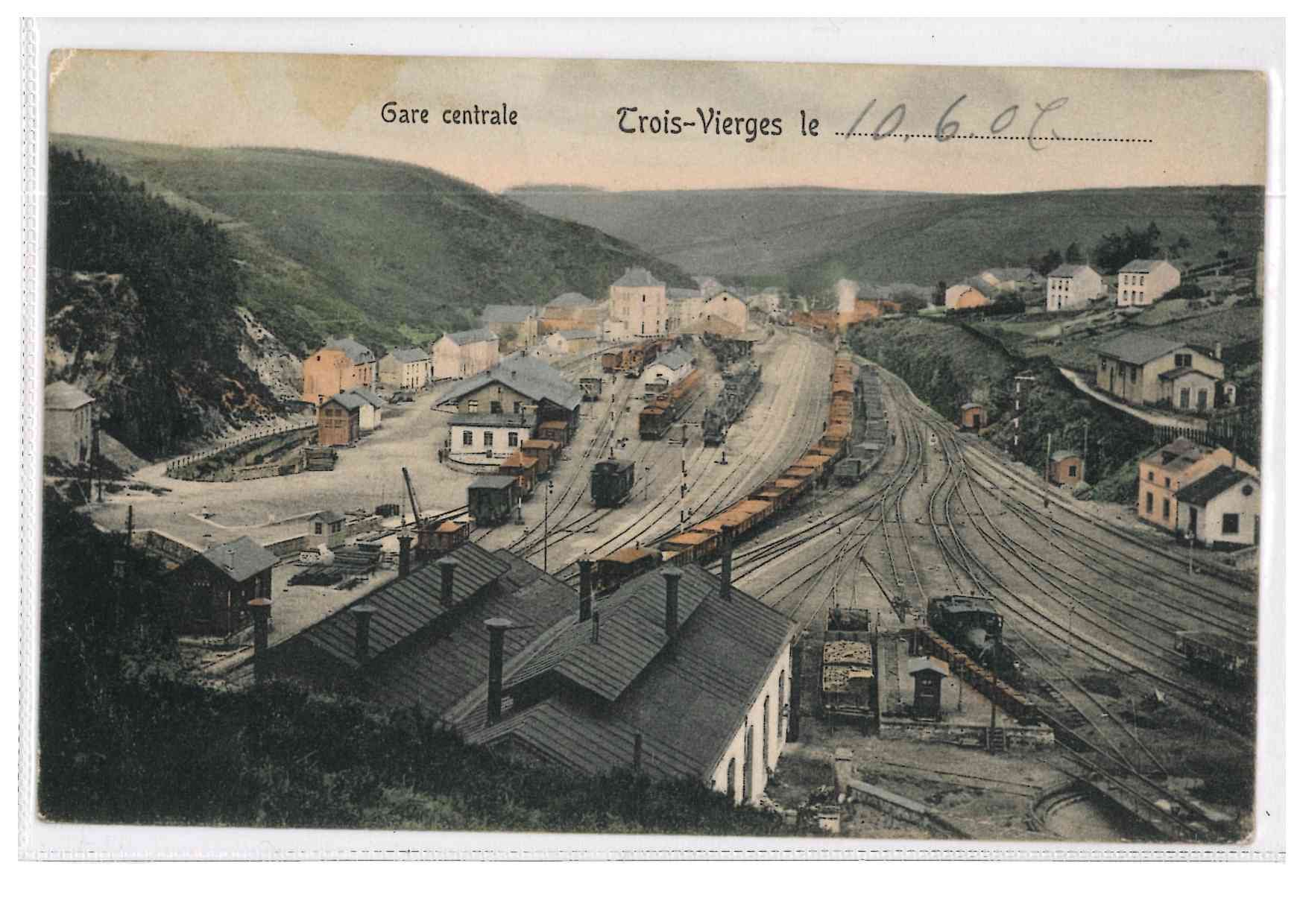 TROISVIERGES. Carte postale colorisée de la gare centrale. Edition Herm. Wagener, Trois-Vierges, 1907