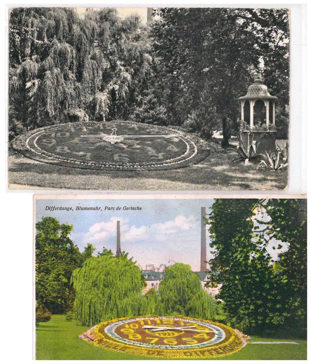 DIFFERDANGE. Réunion de 2 cartes postales de l'horloge de fleur de Differdange, Messagerie Paul Kraus et Othon Anen Papeterie de Differdange