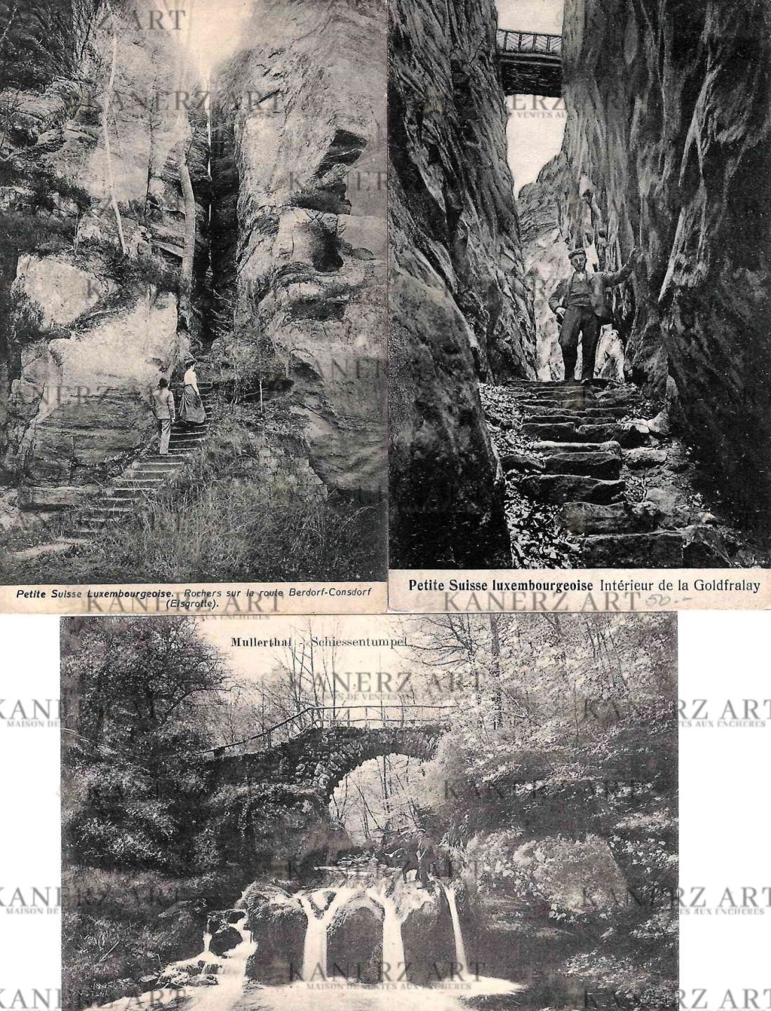 MULLERTHAL . 1. Rochers sur la route Berdorf-Consdorf, E. Zenner, No. 9026, 1908, 2. Intérieur de la Goldfralay, E. Zenner, No. 59, ca. 1910, pas de texte + pas voyagée, 3. Schiessentumpel, E. Zenner, ca. 1910, pas de texte + pas voyagée (De la collection Norbert HANSEN)