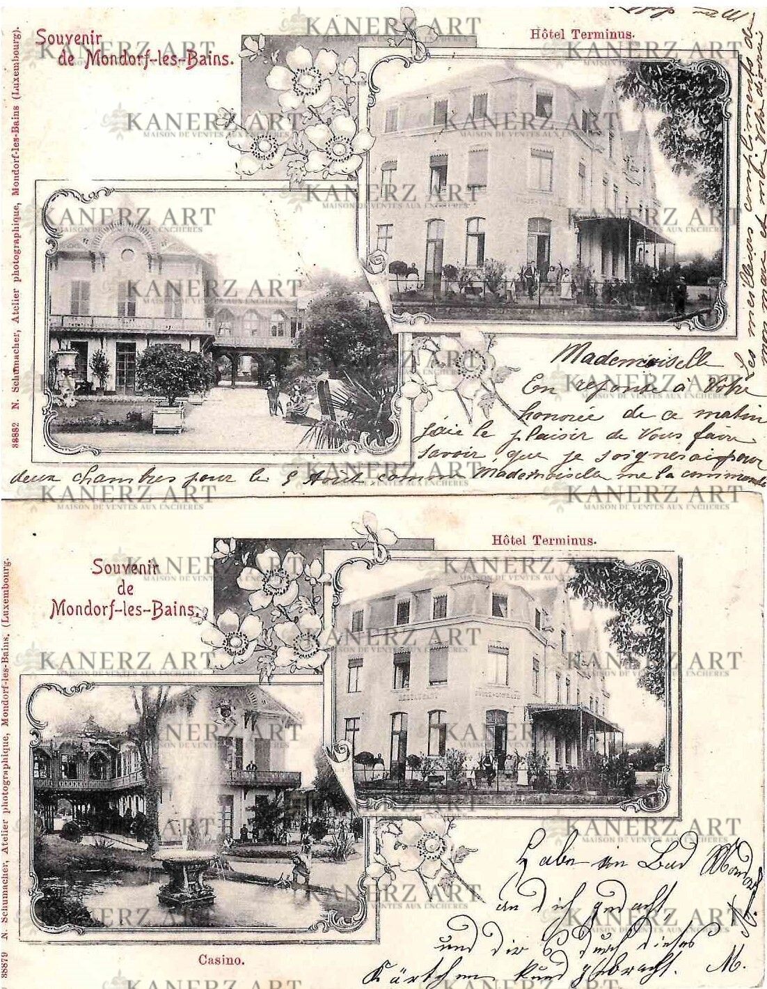 MONDORF . 1. Hôtel Terminus, N. Schumacher, No. 38882, 1901, 2. Hôtel Terminus et Casino, N. Schumacher, No. 38879, 1901 (De la collection Norbert HANSEN)