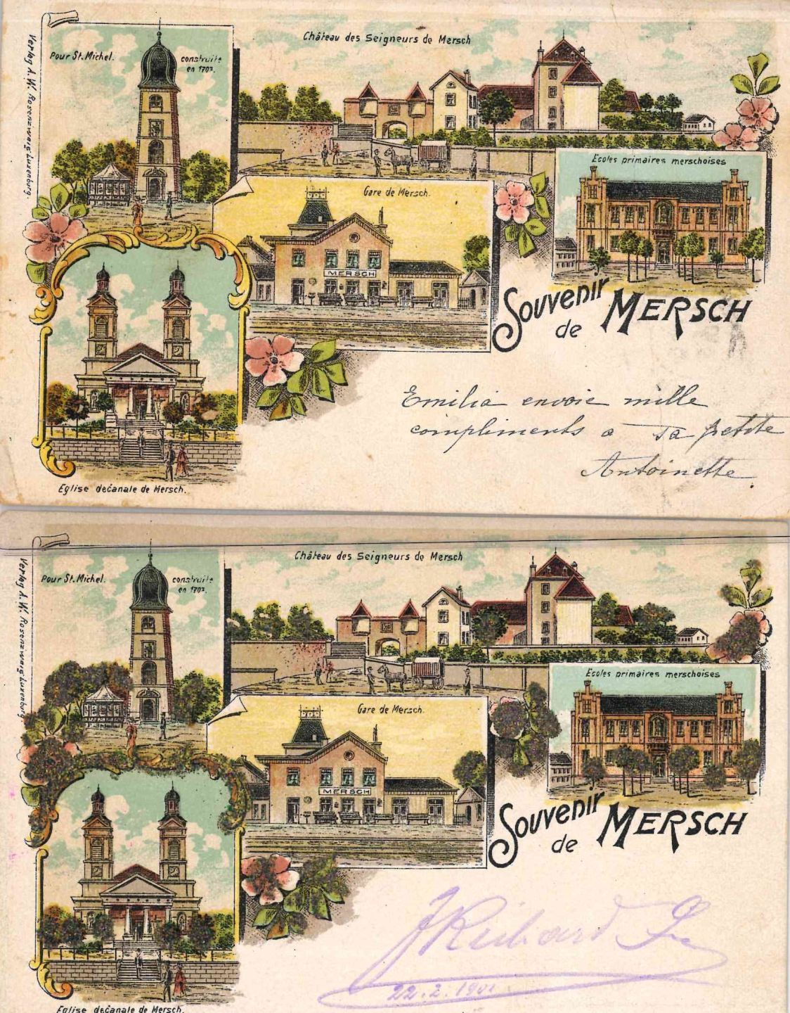 MERSCH. Réunion de 2 cartes postales identiques Verlag ROSENZWEIN Luxemburg, ca 1900